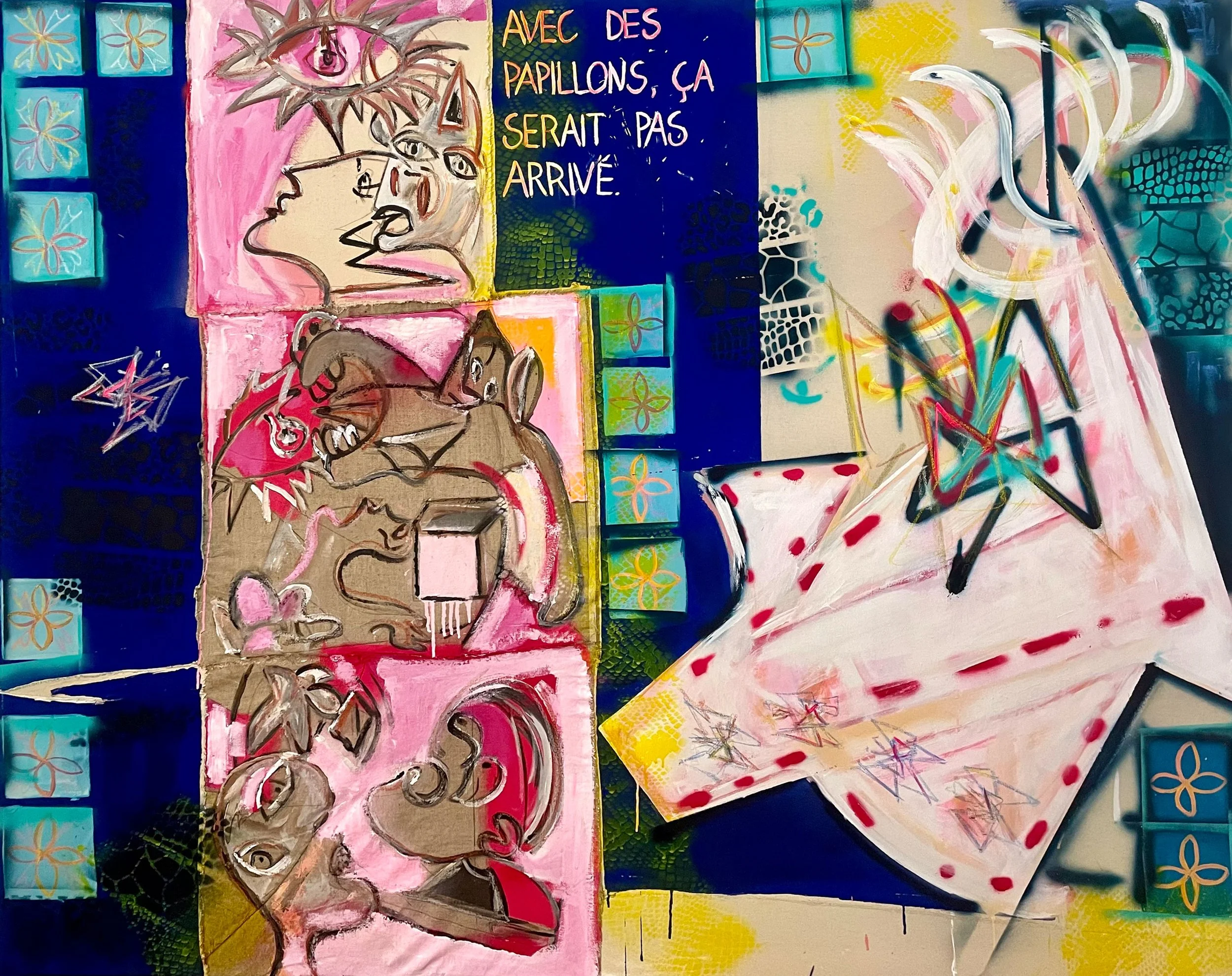 Als Reaktion auf die Häufung von Kriegen und Konflikten in der Welt gab Leonhard im Herbst 2023 bei Reby ein Gemälde in Auftrag, das auf die aktuelle Geopolitik Bezug nehmen sollte. Er bittet darum, Motive aus Picassos „Guernica“, einen Flugzeugträger aus Papier und Schmetterlinge in das Bild zu integrieren. Es ist kein Zufall, dass Leonhard „Guernica“ wählt, denn das Bild hat eine starke politische Konnotation. Mit diesem Gemälde prangerte Picasso die Bombardierung von Guernica im Jahr 1937 während des spanischen Bürgerkriegs an. Diese Bombardierung wurde von den spanischen Nationalisten angeordnet und von deutschen Nazi-Truppen und italienischen Faschisten ausgeführt. Indem Reby diese „Guernica“-Motive auf diesem alten, genähten rosafarbenen Streifen aufgreift, verweist sie auch auf den Gazastreifen, der im Herbst 2023 angegriffen wurde und seitdem ein Ort der Verzweiflung, des Hungers, der Gewalt - des Krieges - ist.